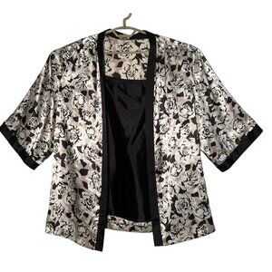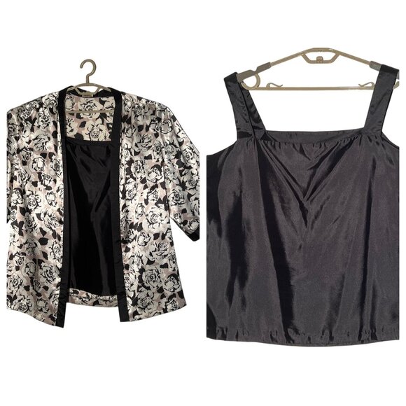 Black and white rose floral, 1/2-sleeve, open-front cardigan with a black pull-over tank top.