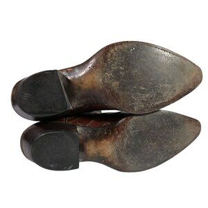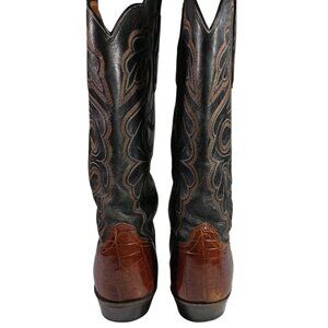 This is a pair of VTG El Dorado Alligator Cowboy Boots for women in size 8.5. These handmade boots feature exotic Embroidered detailing, perfect for a Western cowboy theme. Made from leather, these brown boots are stylish and unique, adding a touch of character to any outfit. The brand, El Dorado, is known for producing high-quality and authentic cowboy boots, making these boots a desirable choice for those looking to make a statement with their footwear.