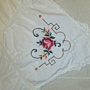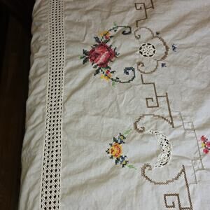 VTG Embroidered Cross Stitch Linen Tablecloth 112x64 White Crochet Edge Handmade