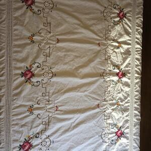 Beautiful vintage embroidered and hand cross-stitched linen tablecloth featuring intricate needlework, delicate crochet edging, and classic white linen. Measures 112 x 64 inches — perfect for large dining tables, vintage décor, farmhouse, cottagecore, shabby chic, or special occasions.