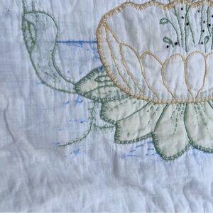 VTG Embroidered Lily Pad Floral Hand Stitched Quilt Lavender White Unique FLAWS