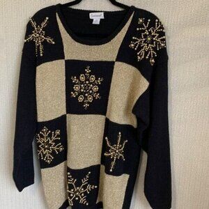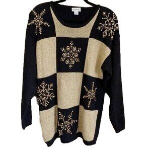 VTG Eminent Christmas Women Sweater Medium Black Gold Intricate Bead Snowflake
