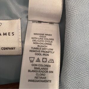 Pastel blue linen blend blazer. Single breast pocket. Shoulder pads. Shape seaming. Small side vents.