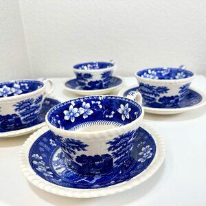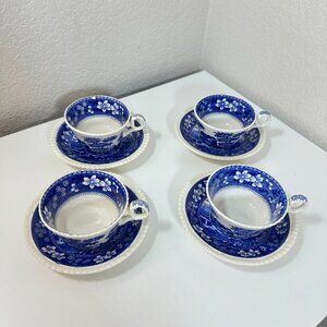 VTG English Copeland Spode's Tower Blue/White Tea Cups & 6" Saucers- Set of 4