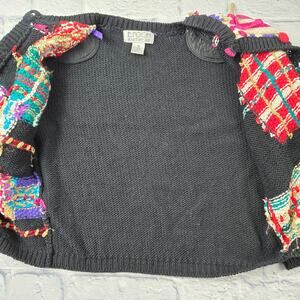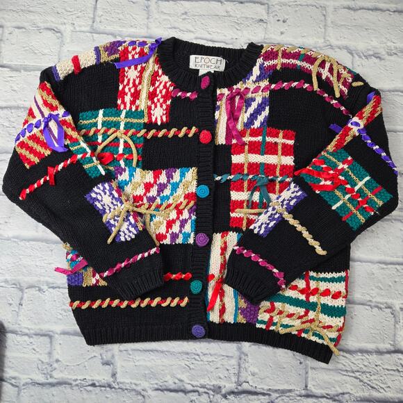 VTG Epoch Knitwear Embellished Cardigan Black Patchwork Button Sweater sz Medium