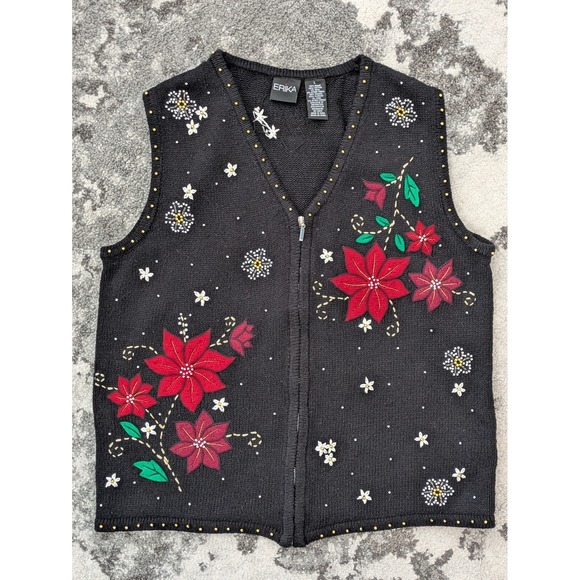 VTG Erika Christmas Sweater Vest Beaded Embroidered Holiday Poinsettia . Condition is Pre-owned - Excellent. Shipped with UPS Ground Saver.
