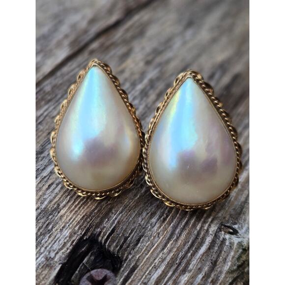 VTG Estate 14K Yellow Gold Mabe Pearl Teardrop Omega Back Twisted Rope Earrings