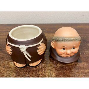 This auction is for a set of 3 Goebel Hummel Friar Tuck Monk pieces. Included is a 4” tall creamer, 4 ½" sugar bowl with lid and tray. These have different TMK markers on the bottoms. There is some crazing/wear. The creamer has a slight chip on the spout. Nice set.
