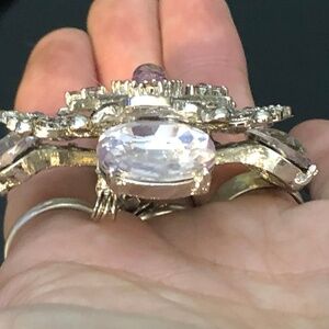 Gorgeous estate sale piece, ornate design, covered in Aurora Borealis rhinestones and flanked in each corner by a large oval glass lavender stone. Sits up pretty high in a dome like profile.