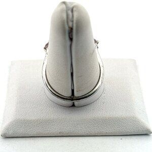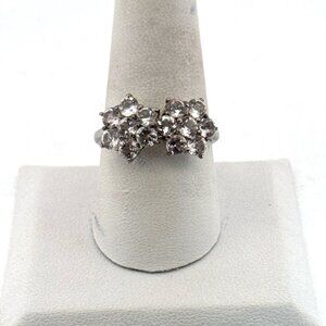 This stunning estate ring features a dazzling double-cluster floral design, crafted in solid sterling silver and stamped 925 TGGC for authenticity. The bypass setting creates a unique and elegant silhouette, with two sparkling flower clusters, each composed of round brilliant-cut clear stones (likely CZ or white topaz), arranged for maximum shine and dimension. The ring is a Size 9 and weighs 3.3 grams.