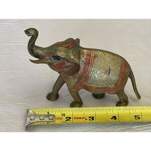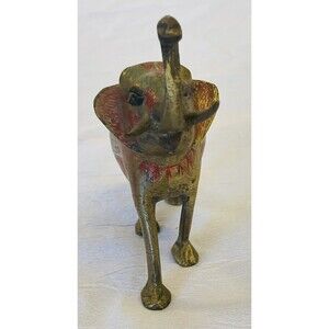 Vintage Etched Brass Elephant Figurine Painted Trunk Up Heavy Boho Paper Weight