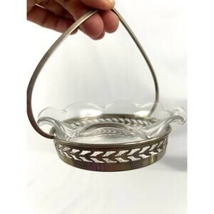 VTG Etched Cut Glass Candy Dish Small Basket Holder Sterling J44
