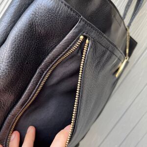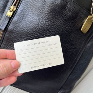 Vintage Evan-Picone black leather tote bag in excellent pre-owned condition. Crafted from full-grain leather with a fabric lining, this structured bag combines classic style with practical design. Features multiple compartments and the original solid brass Evan-Picone hang tag.