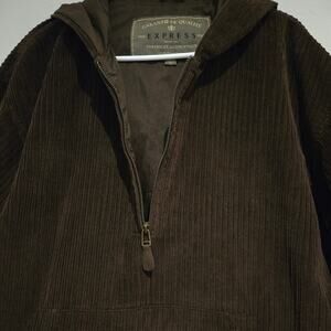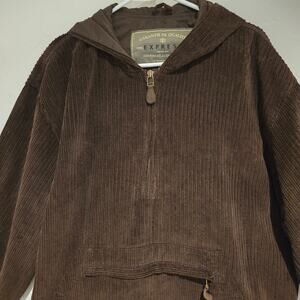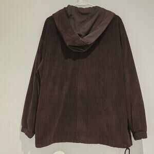 Excellent condition - mid-wale dark brown 100% cotton corduroy pullover jacket with zipped front pocket, Kanga slip-in pockets and attached hood. It's fully lined, 1/2-zip style with drawstring at hem and wide elasticized cuffs. Tagged as a Size Small - oversized fit - measures 24" armpit to armpit & 26" long. Made in Korea.