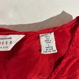 Details: Red scoop neck silk button up top. Front has 2 cinching pleats for shape.