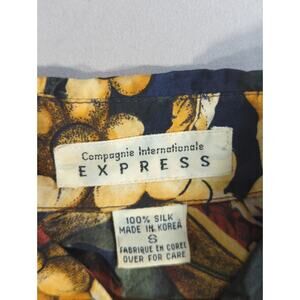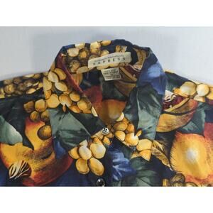 This vintage Express silk shirt is a true gem! It features a vibrant fruit print that's perfect for adding a pop of color to your wardrobe. The long sleeves and button-front design make it versatile for different occasions.