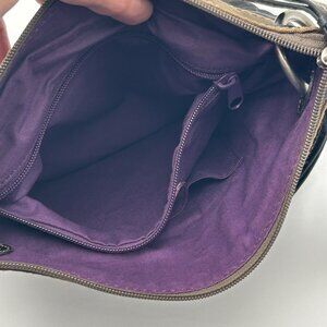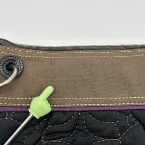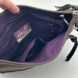 This vintage FOSSIL Key-Per crossbody bag (style ZB4422) features a black floral quilted body made from a silky-feeling fabric, paired with a contrasting canvas upper section where the strap is attached. The bag is fully lined in purple fabric and finished with silver-tone hardware, a zip top closure, and interior/exterior pockets for function and style.