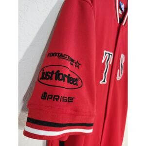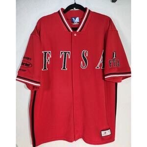 The VTG FTSA Vision Jersey Shirt for men in size large is a red soccer shirt by New Balance, specifically made for the Just For Feet Uprise team. This jersey is designed for fans of international soccer clubs and features the team's logo and colors. It is a stylish and comfortable piece of fan apparel that allows supporters to show their allegiance to their favorite team on and off the field.