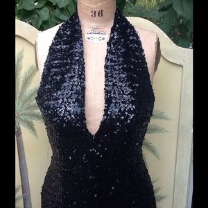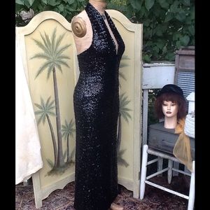 If this isn't sexy then I don't know what is...its a fully Sequined halter gown,it's in all black sequins as well as body of gown, it has a very low cut halter bodice, back zipper and fully lined the portion that goes around the neck has hook & eye closures but the thread eyes no longer exist needs new eyes,otherwise it's in Excellent condition don't see any missing sequins!! It's fully lined...measurements: L:60", B:30, W:14", Hips:-17" has a little give not a lot!JUST IN TIME FOR XMAS PARTIES