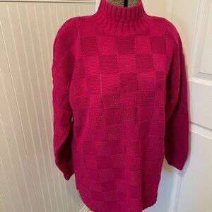 Vintage Fushia Pink Casual Corner sweater featuring a chunky-knit design and a mock turtleneck. This long-sleeved dropped shoulder pullover is made from a breathable cotton and ramie blend that stretches to fit your body perfectly. The checkerboard knit pattern and relaxed fit add a vintage touch to this machine-washable sweater, which is perfect for the winter, summer, fall, and spring seasons. The sweater is size M and is ideal for women who want to wear something comfortable that covers well but is stylish. Currently has shoulder pads which are easily removed.