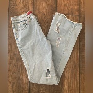 VTG Fadannu Juniors Denim Y2K Distressed Low-Rise Vintage Bootcut Stretch Jeans Woman Size 26”. Light blue wash with sheer lace and pearl bead accents.