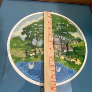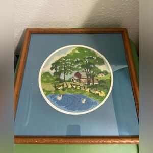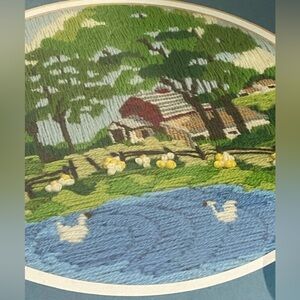 VTG Farm Scene Longstitch Embroidered Needlepoint Pond trees barn ducks framed
