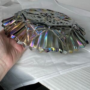 VTG Federal Glass Pioneer 10” blue smoke saw tooth edge fruit bowl. Fruit design. This is a type of Carnival Glass. No chips cracks or repairs.