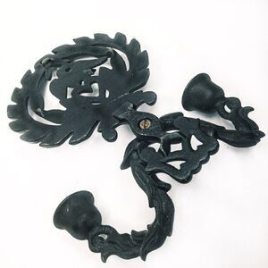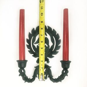 Beautifully ornate cast iron wall sconce featuring an eagle, a laurel crown/wreath, several hearts, and robust foliage. Holds two standard taper candlesticks.