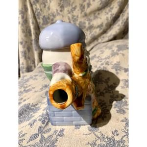 Charming vintage Humpty Dumpty teapot (for decorative purposes only). HD is depicted perched upon the wall, clearly from before his infamous tumble. His bent arm creates the handle and a nearby branch serves as the spout.