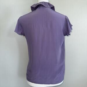 Elegant vintage Finn Wright Mason 100% silk blouse in a soft lilac purple shade, women’s size 1 (fits like a small). Features a ruffled stand collar, short flutter sleeves, and a classic button-front design. The lightweight pure silk fabric drapes beautifully with a subtle sheen — timeless and feminine.