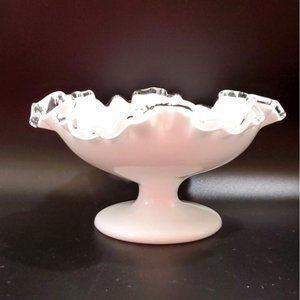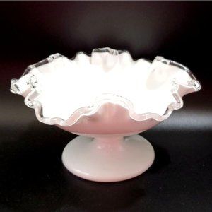 VTG Fenton Silver Crest Milk Glass Pedestal Compote Ruffled Clear Crimped Candy