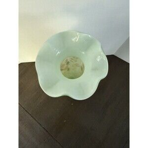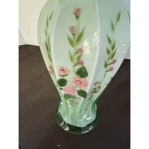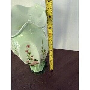 VTG Fenton Style Opaline Green Cased Glass Ruffle Floral HandPainted Vase 8”