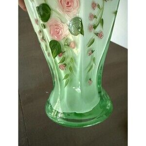 Fenton?? Green Cased Glass Ruffle Vintage Floral Hand Painted Roses Vase.