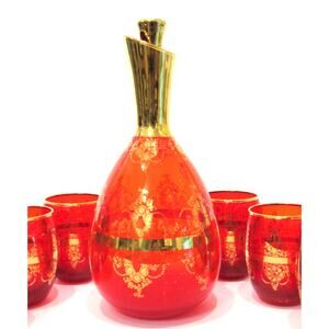 VTG Ferro Lazzarini Italian MURANO GLASS 10" DECANTER SET 8PC Ruby Red 24k Gold