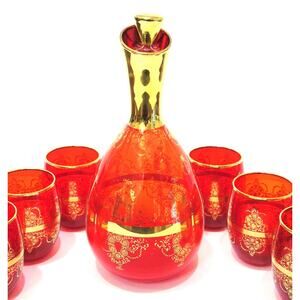 Vintage Ferro & Lazzarini Italian MURANO GLASS DECANTER SET 8PC Ruby Red Hand Painted 24k Gold Floral Scroll - NEW Condition!