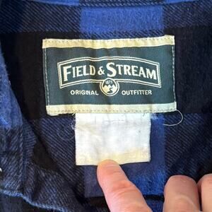 VTG Field & Stream Flannel Shirt Heavyweight Workwear Buffalo Check Mens Large. 100% cotton, very heavyweight, soft, durable and thick. Double front pockets. Relaxed loose fit. Ideal for workwear, layering. Blue and black buffalo check/plaid. Excellent condition. Smoke free home. NEXT DAY SHIPPING.