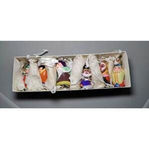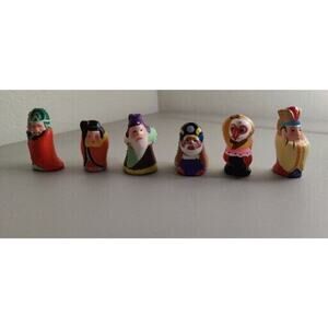 This vintage set of six lucky gods figurines is a rare find for collectors of Asian culture and art. Handmade in China and painted with intricate details, each figurine measures 2 inches in height. The set includes various lucky gods representing wealth, longevity, and good fortune. These figurines are perfect for displaying in a collection or as unique home decor.