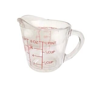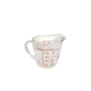 This vintage Fire-King measuring cup by Anchor Hocking is made of clear pressed glass with red graphics indicating measurements in both cups and metric units. The 1 cup (1/4 liter) capacity makes it a practical and stylish addition to any kitchen. Known for its quality and durability, Fire-King products are highly collectible and sought after for their nostalgic charm.