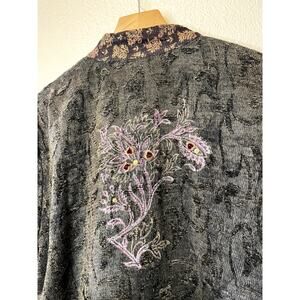 Features: Silky Lining, Pockets, Carved Wood buttons, Boho Tapestry style fabric. Cotton, Wool, Rayon blend.