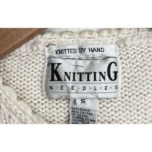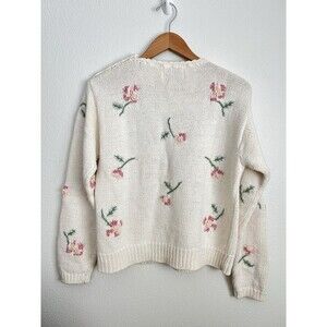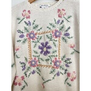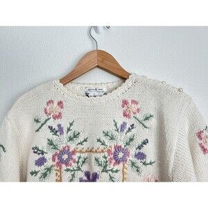 VTG Floral Embroidered Chunky Sweater Handmade Knit Pearl Button Cottage Granny