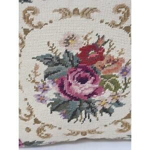 VTG Floral Needlepoint Pillow Velvet Back 14x14 Cottagecore Bouquet Grandma