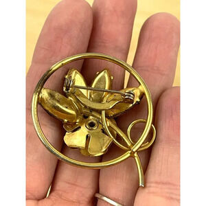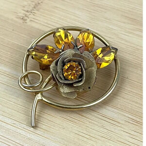 VTG Floral Orange Rhinestone Round Brooch Pin Prong Set 1960's