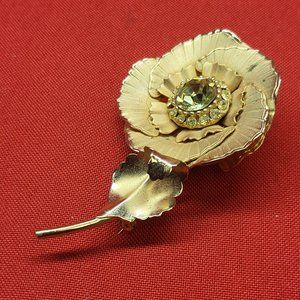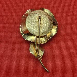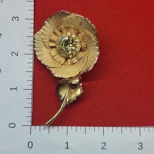 VTG Flower Leaf Brooch Pin Gold Tone Yellow Glass Stone