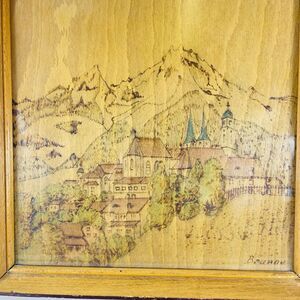 Keywords: Vintage, Folk Art, Pyrography, Wood Burning, Hand Colored, Signed, Braune, Mountain Scene, Rustic Decor, Cabin Decor, Woodland Art, Wall Art, Collectible Art, Unique, Handcrafted