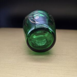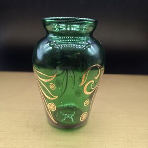 VTG Forest Green Depression Glass Vase Embellished w Gold Gilt Leaves 3.5" tall