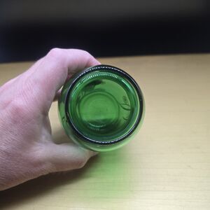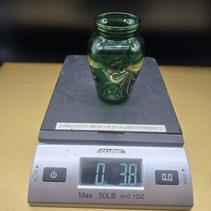The VTG Forest Green Depression Glass Vase embellished with gold gilt leaves is a vintage piece originating from the Americas. Standing at 3.5" tall, this art glass vase features a beautiful leaf pattern in forest green and gold, adding a touch of floral and garden theme to any space. The glossy finish and fused glass production technique enhance the overall elegance of this original piece, making it a unique and charming addition to any collection or decor.