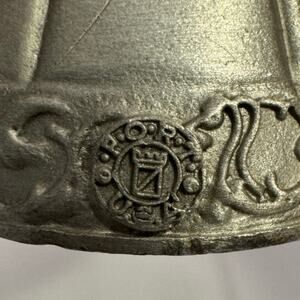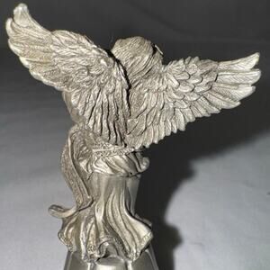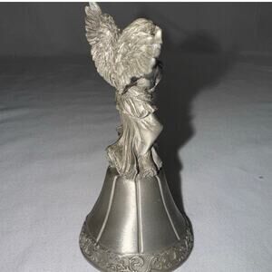 The product is a vintage Fort USA bell made of solid pewter, standing at 3 1/2 inches tall. This handmade bell features a guardian angel playing a lyre, adding a unique and sentimental touch to the piece. The bell is crafted in the United States, showcasing a silver color that adds to its elegant appearance. Perfect for collectors or those looking to add a special touch to their decor, this bell is a charming and nostalgic piece that captures the essence of nostalgia and whimsy. Perfect for collectors of pewter, Christmas Bells, or Angel Figurines!