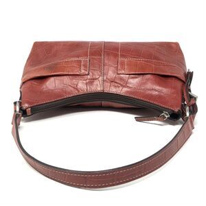 Vintage Y2k Fossil 1954 Crescent Shaped Leather Shoulder Bag. Faux Crocodile embossed in Siena (Rust Red) with nickle hardware. Style Stamp #75082. Features zip closure, two exterior pockets, inside zip pocket plus two accessory pockets, has original Fossil key charm.