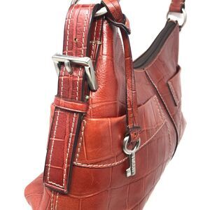Vintage Y2k Fossil 1954 Crescent Shaped Leather Shoulder Bag. Faux Crocodile embossed in Siena (Rust Red) with nickle hardware. Style Stamp #75082. Features zip closure, two exterior pockets, inside zip pocket plus two accessory pockets, has original Fossil key charm.