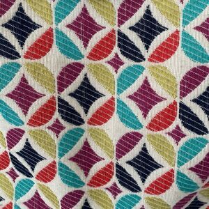 A leather & fabric bag featuring a vibrant geometric pattern. Perfect for adding a pop of color to any outfit. The tan strap and accents provide a classic touch.